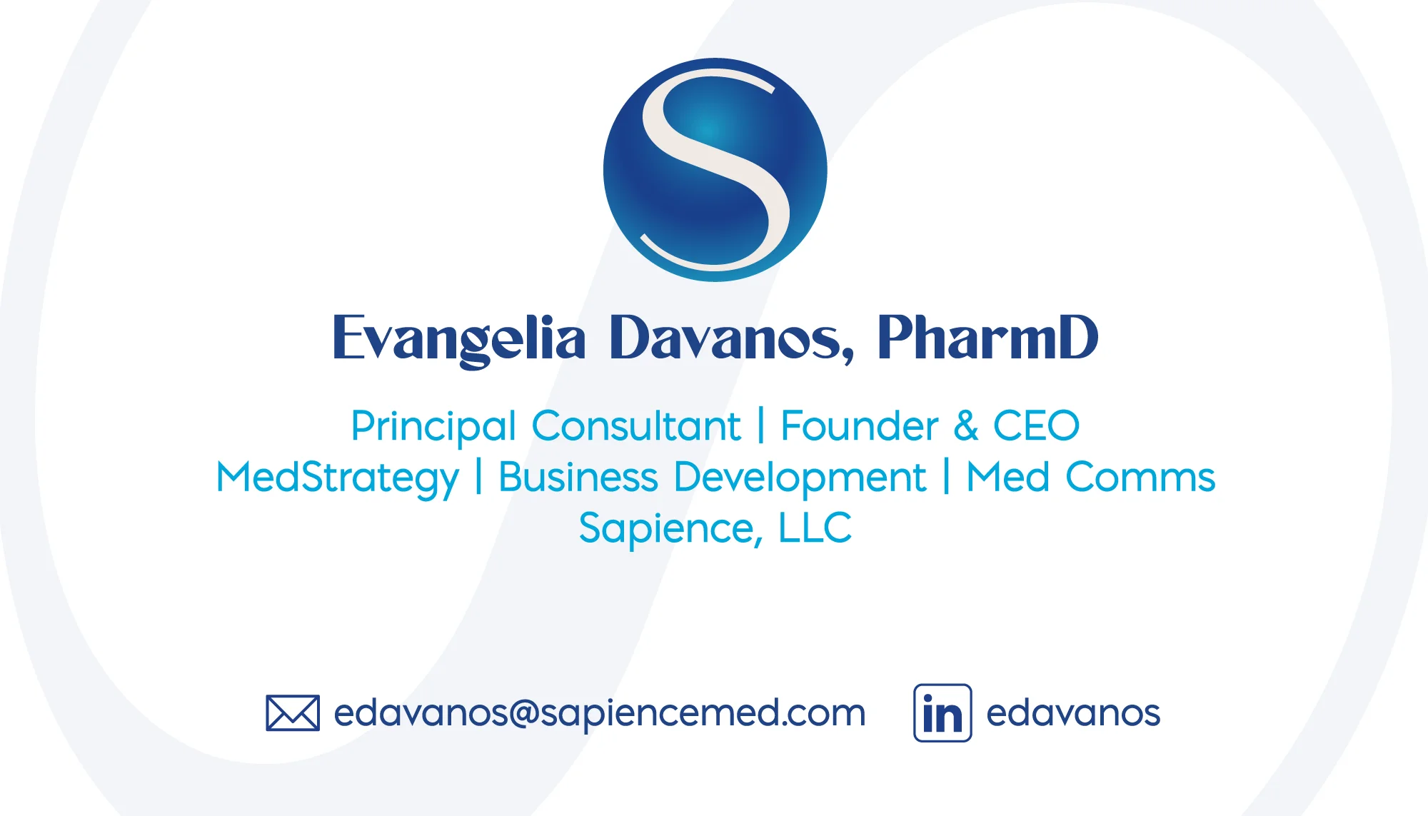 Custom letterhead incorporates the full logo, tagline “medical affairs consulting,” website, and social icons in a horizontal blue layout for professional correspondence. Business cards showcase front-side details for Evangelia Davanos—title as CEO, MedStrategy | Sapience, LLC | Med Comms—with email and LinkedIn, paired with a sophisticated back design.